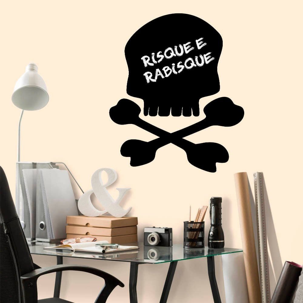 Este modelo, Adesivo de Parede Lousa Caveira, pode ser usado em praticamente qualquer superfície lisa, pode ser utilizado para decorar quarto infantil, sala, sala de estar, sala de tv, cozinha, hall de entrada, quarto de casal, bar, espaço gourmet, cabeceira de cama, escritório, banheiro, box de banheiro, etc...