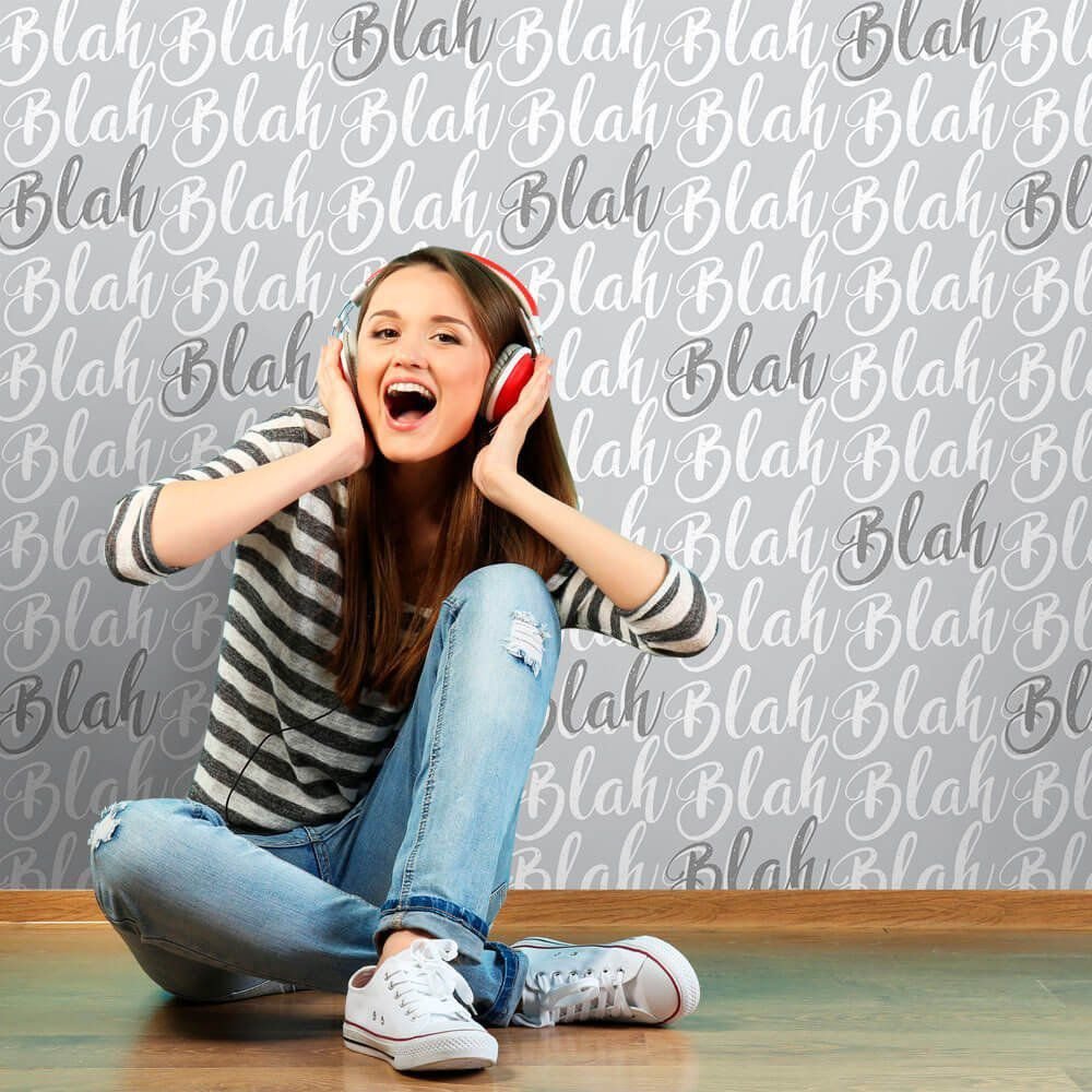 O Papel de Parede Blah Blah Gray é fabricado em adesivo vinil fosco 3M, autocolante e com excelente qualidade de impressão. Não precisando de cola.