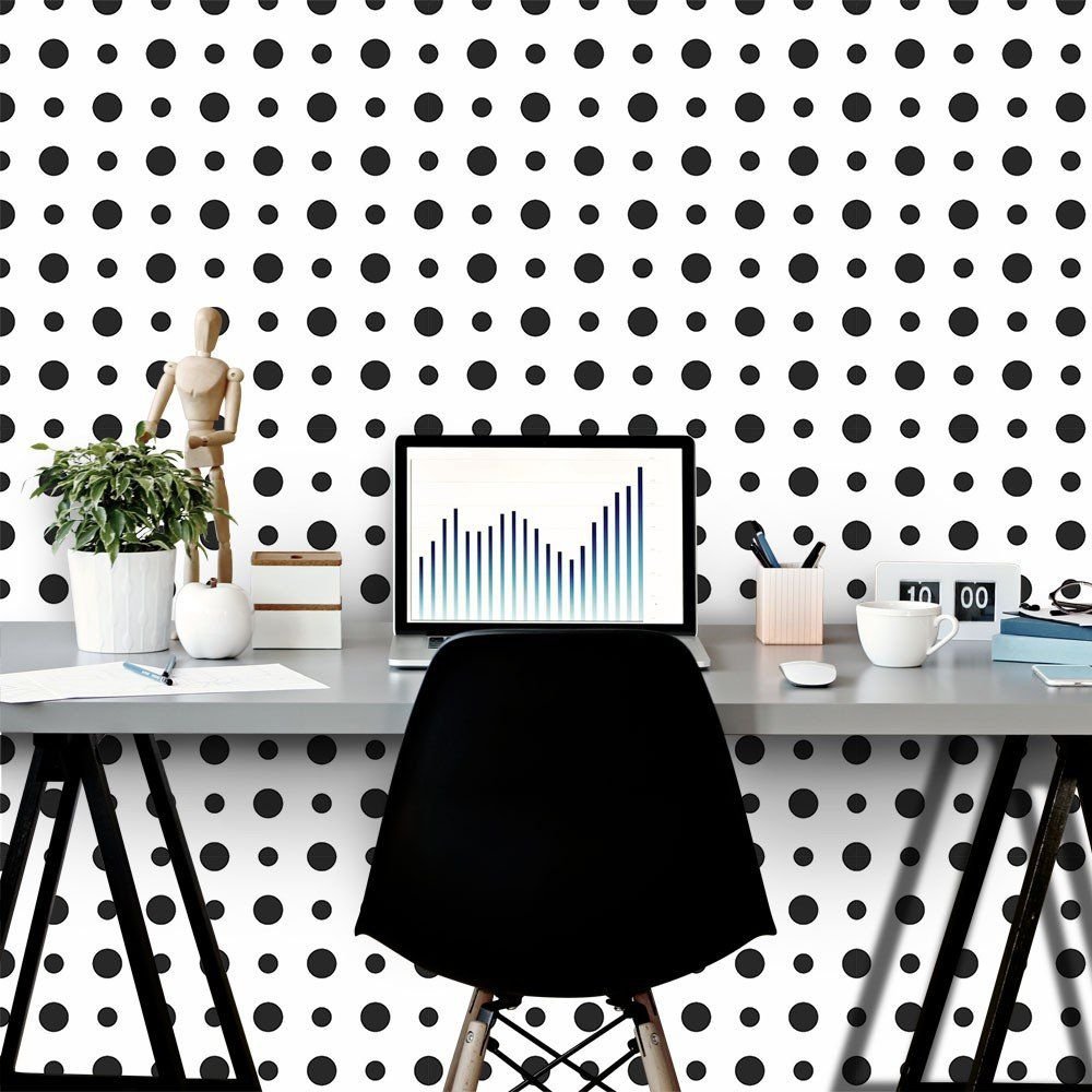 O Papel de Parede Bolinhas PeB é fabricado em adesivo vinil fosco 3M, autocolante e com excelente qualidade de impressão. Não precisando de cola.
