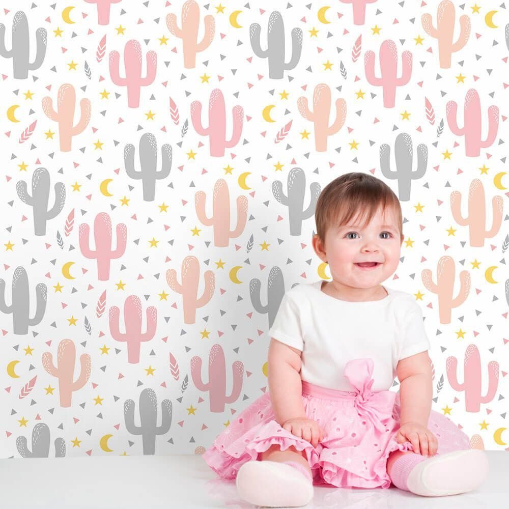O Papel de Parede Cactos Baby Girl é fabricado em adesivo vinil fosco 3M, autocolante e com excelente qualidade de impressão. Não precisando de cola.