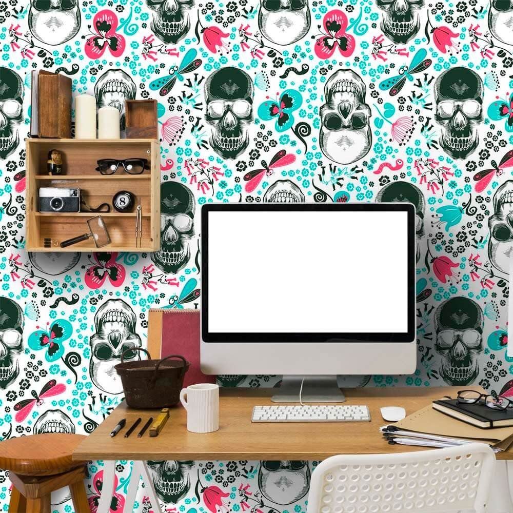 O Papel de Parede Caveiras Divertidas é fabricado em adesivo vinil fosco 3M, autocolante e com excelente qualidade de impressão. Não precisando de cola.