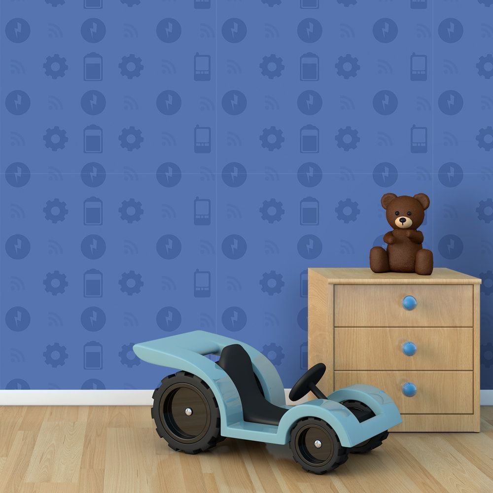 O Papel de Parede Configurações Azul é fabricado em adesivo vinil fosco 3M, autocolante e com excelente qualidade de impressão. Não precisando de cola.
