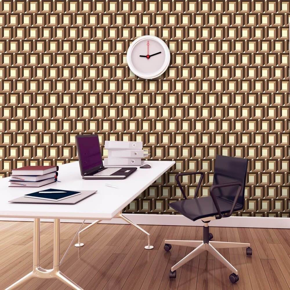 O Papel de Parede Cubo Ilusionista Coffee é fabricado em adesivo vinil fosco 3M, autocolante e com excelente qualidade de impressão. Não precisando de cola.