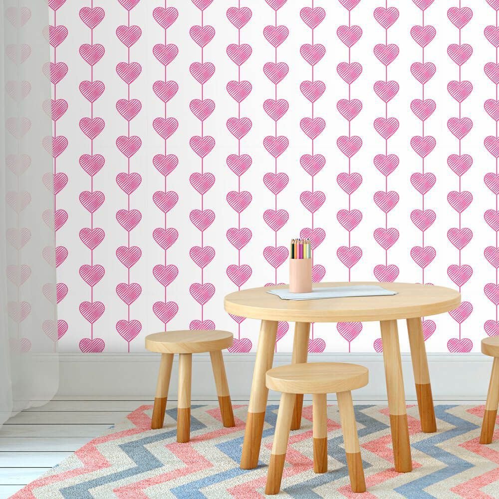 O Papel de Parede Heart Curtain Pink é fabricado em adesivo vinil fosco 3M, autocolante e com excelente qualidade de impressão. Não precisando de cola.