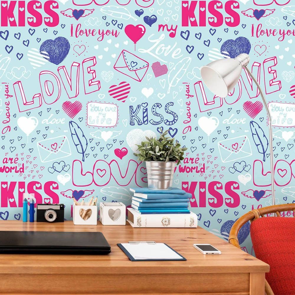 O Papel de Parede I Love You é fabricado em adesivo vinil fosco 3M, autocolante e com excelente qualidade de impressão. Não precisando de cola.