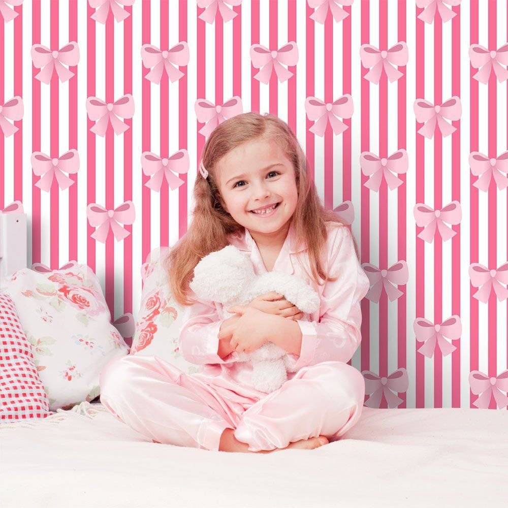 O Papel de Parede Laços Cute é fabricado em adesivo vinil fosco 3M, autocolante e com excelente qualidade de impressão. Não precisando de cola.