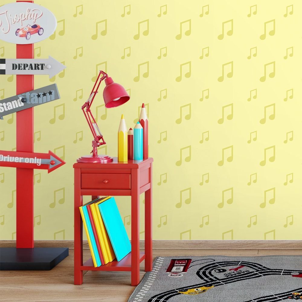 O Papel de Parede Notas Musicais Amarelas é fabricado em adesivo vinil fosco 3M, autocolante e com excelente qualidade de impressão. Não precisando de cola.