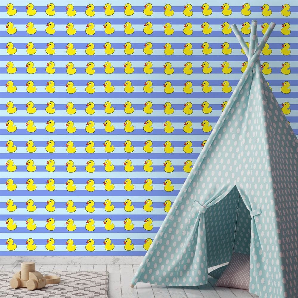 O Papel de Parede Patinhos Borracha é fabricado em adesivo vinil fosco 3M, autocolante e com excelente qualidade de impressão. Não precisando de cola.