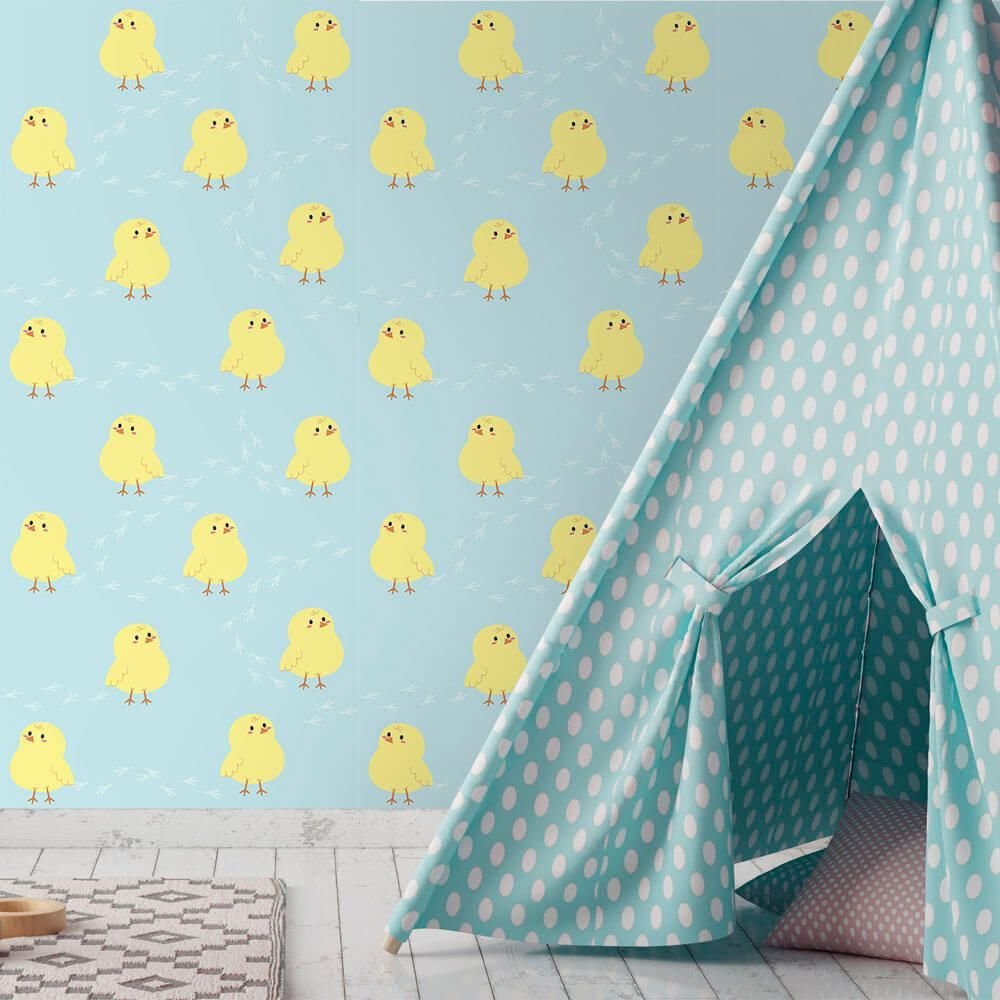 O Papel de Parede Pintinhos é fabricado em adesivo vinil fosco 3M, autocolante e com excelente qualidade de impressão. Não precisando de cola.