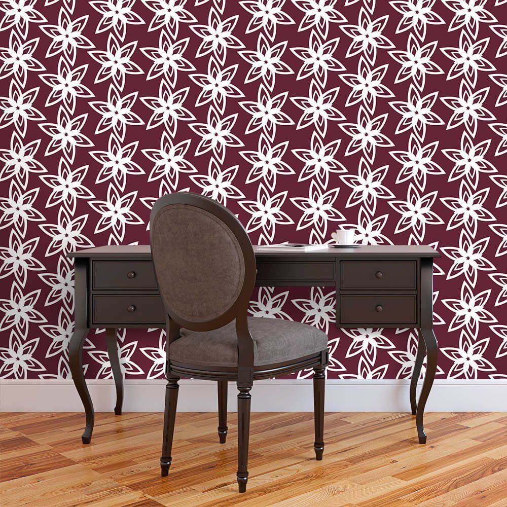 O Papel de Parede Pontas Floridas Burgundy é fabricado em adesivo vinil fosco 3M, autocolante e com excelente qualidade de impressão. Não precisando de cola.