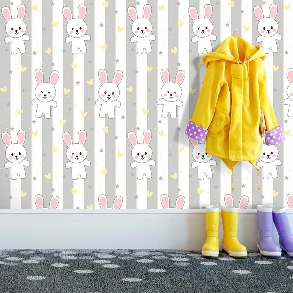 O Papel de Parede Rabbit Gray é fabricado em adesivo vinil fosco 3M, autocolante e com excelente qualidade de impressão. Não precisando de cola.