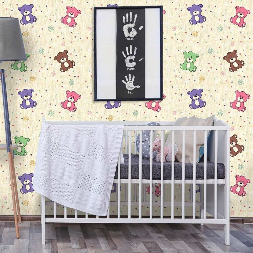 O Papel de Parede Ursinhos Ted é fabricado em adesivo vinil fosco 3M, autocolante e com excelente qualidade de impressão. Não precisando de cola.